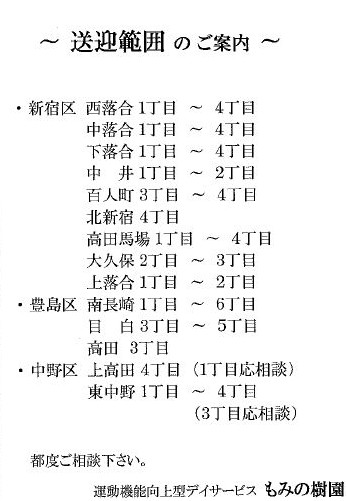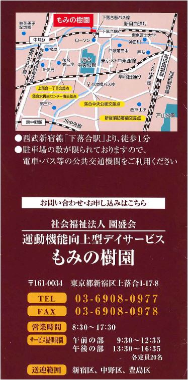 デイサービスのご案内「 特別養護老人ホーム もみの樹園 」開設しました。 あなたの介護・リハビリ ライフ応援します。2017年8月1日より新規開設しました( もみの樹園内 1 階 )「新宿区 西落合」の皆様、新規入所募集中です。スタッフ一同 心よりお待ち申し上げ |
